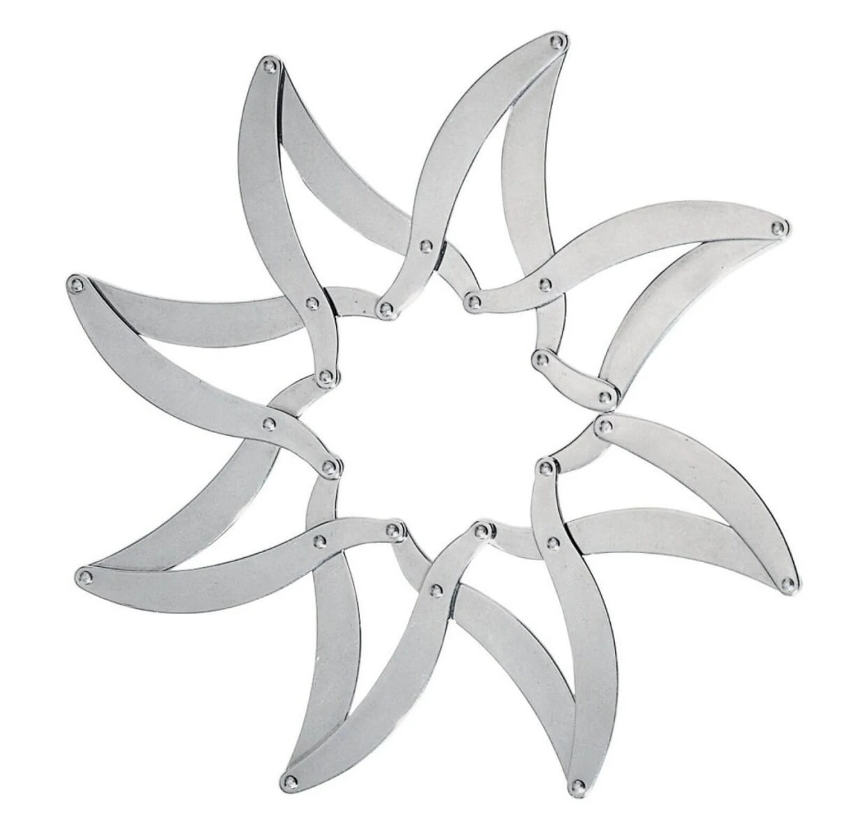 De uittrekbare Alessi Augh! pannenonderzetter is vervaardigd uit glanzend roestvrij staal en heeft de vorm van een ster. Het design is ontworpen door het duo D’Urbino en Lomazzi. De onderzetter heeft een diameter van 24 cm en een hoogte van 1,2 cm. Gebruik de pannenonderzetter voor het plaatsen van pannen op tafel.