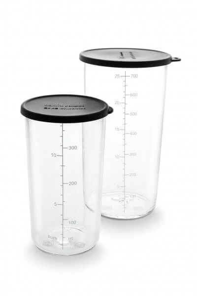 De Bamix mengbekerset bestaat uit 2 glazen mengbekers met een inhoud van 400 ml en 700 ml. Met deze bekers kunt u bijvoorbeeld eenvoudig mayonaise maken. Dankzij de deksel kunt u uw bereidingen eenvoudig wat langer bewaren. Bijvoorbeeld te gebruiken in combinatie met een staafmixer.