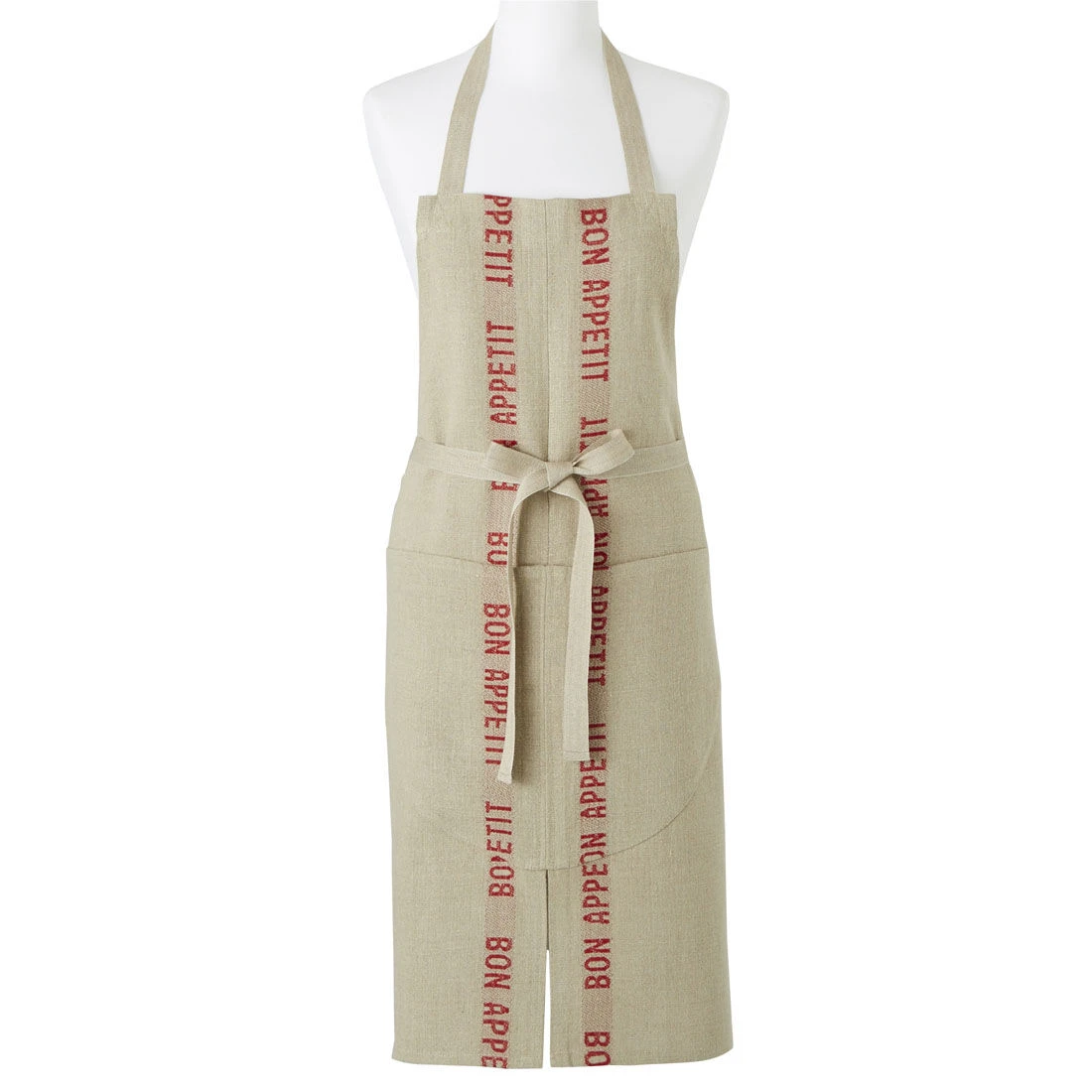Het Charvet BON APPETIT schort is vervaardigd uit 100% linnen. Het schort is geweven in een beige kleur en is in het midden voorzien van een rode tekst: BON APPETIT. Het schort heeft een lengte van 85 cm en is 83 cm breed en heeft aan de voorzijde twee vakken om eventueel spullen in op te bergen. Gebruik het schort tijdens het koken of bakken ter bescherming van uw kleding.
