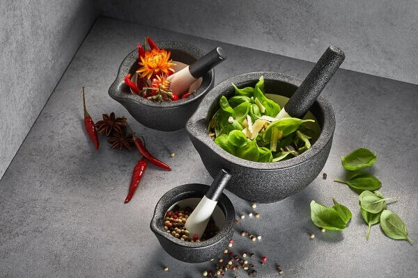De Grino vijzels zijn allen voorzien van een handig schenktuit voor het gemakkelijk verwerken van kruidenpasta’s of pesto’s. De stamper in de Grino lijn heeft een wit eindje en ligt comfortabel in de hand. Met een vijzel bereidt u zelf eenvoudig de heerlijkste pesto’s, sambal, guacamole en boemboes.
