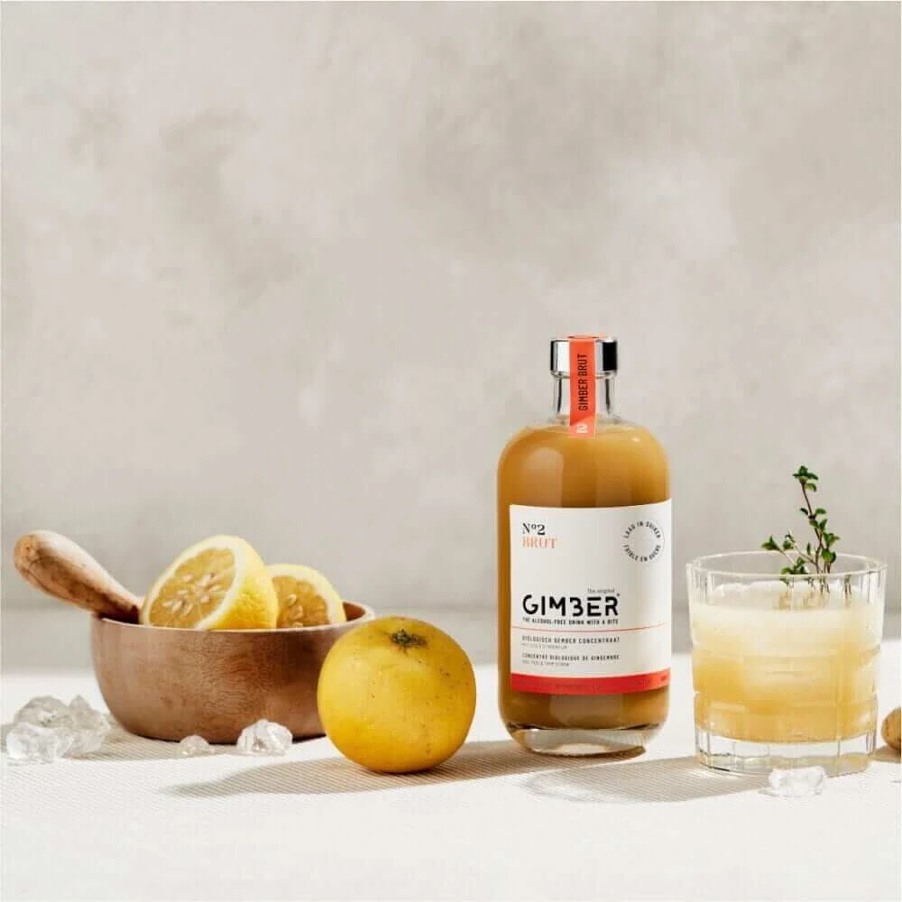 Gimber Brut is een concentraat van gember, op smaak gebracht met rietsuiker, citroen, water en kruiden. Gimber Brut is net zo lekker als de originele Gimber, maar met 50% minder suiker en door de yuzu en citroentijm nog sprankelender. Het concentraat wordt geleverd in een fles van 500 ml en kan worden gebruikt om koude of warme dranken mee te maken, door 1 deel gimber te verlengen met 10 delen water.