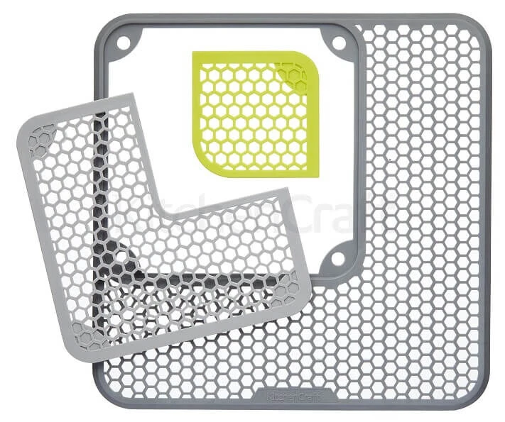 Met de KitchenCraft afdruipmat voor gootsteen 30 cm x 30 cm creëert u moeiteloos extra ruimte voor het drogen van uw glazen en servies. De mat is vervaardigd van stevig kunststof en universeel te gebruiken. Afhankelijk van de plaatsing van de afvoer is de mat verstelbaar van formaat en indeling. Eenmaal toegepast kan de KitchenCraft afdruipmat veilig in de gootsteen blijven liggen, waardoor deze altijd klaar is voor gebruik. Hierdoor biedt hij tevens extra bescherming voor uw gootsteen. De opengewerkte honingraatstructuur zorgt voor een perfecte geleiding van het water. Al met al de perfecte oplossing voor kleine keukens of bijvoorbeeld de caravan.
