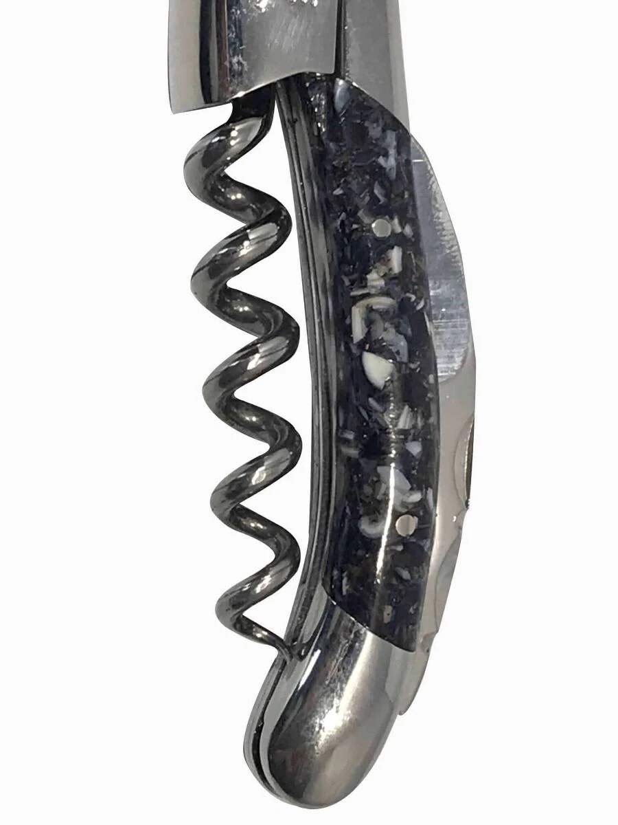 Dit handgemaakte Laguiole en Aubrac kelnersmes heeft een heft dat aan beide kanten is ingelegd met mosselschelpen in de vorm van een mozaïek. Het zakmes is met de hand gemaakt in Aubrac in Frankrijk en bevat een kurkentrekker, klein kartelmesje en flessenopener. Gebruik het kelnersmes om flessen wijn, bier of champagne te openen.