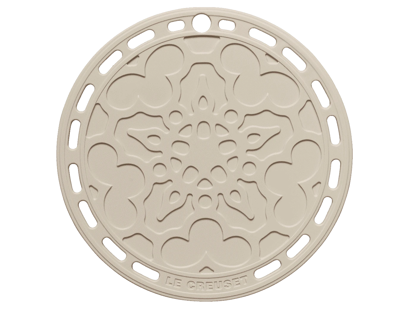 De Le Creuset pannenonderzetter is gemaakt van crème silicone en heeft een diameter van 20 cm. Gebruik de Meringue, flexibele lap als onderzetter of als pannenlap.