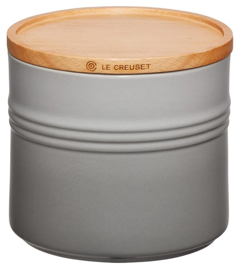 De Le Creuset voorraadpot is gemaakt uit grijs aardewerk en is voorzien van een houten deksel. De voorraadpot heeft een diameter van 14 cm, is 12 cm hoog en heeft een inhoud van 1,5 liter. Gebruik voor het opbergen van diverse ingrediënten.