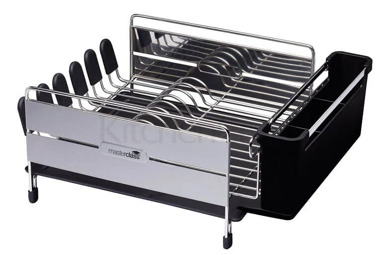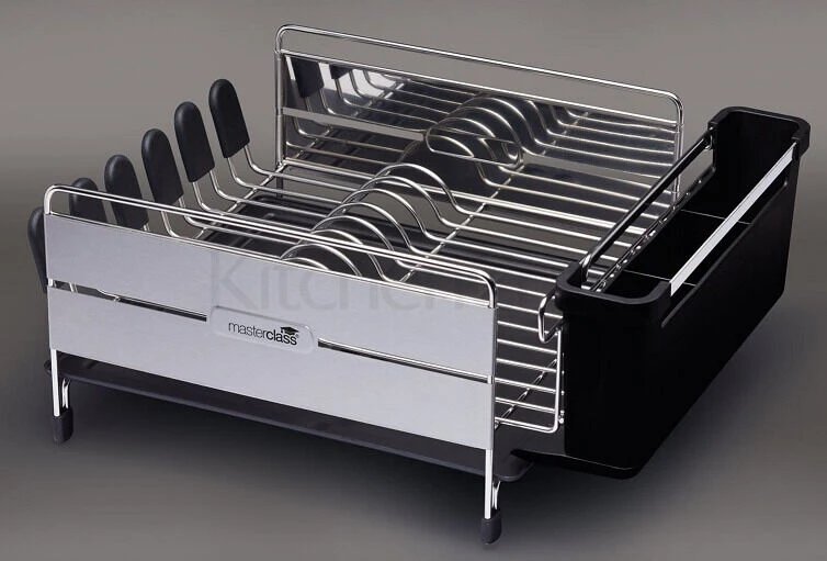 Het roestvrij stalen afdruiprek van MasterClass is een duurzame keuze voor dagelijks gebruik. Dankzij het ruime formaat van 44 cm x 34 cm biedt hij ruimte aan al uw servies, glaswerk en bestek. Het afdruiprek wordt gecombineerd met een opvangblad van stevig zwart kunststof: opgevangen water verdwijnt hierdoor probleemloos in de gootsteen. De pootjes zijn voorzien van beschermende anti-slip voetjes die ontsierende krassen helpen voorkomen. Zo is het rek optioneel ook zonder blad te gebruiken. Het rek wordt compleet geleverd met verwijderbare bestekbak.