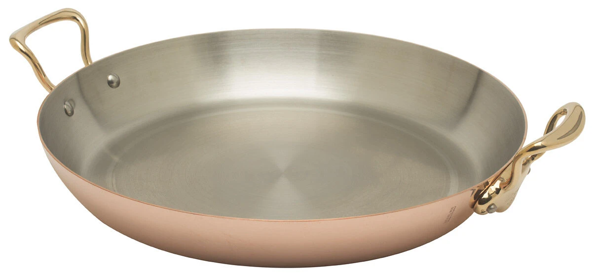 De ronde Mauviel M’150B paellapan heeft een diameter van 35 cm en is voorzien van twee glanzend gepolijste bronzen handgrepen. De pan is gemaakt van 1,5 mm dik koper en aan de binnenzijde afgewerkt met een slijtvaste laag roestvrij staal. Gebruik de serveerpan voor het bereiden en serveren van gerechten als en paella en nasi goreng.
