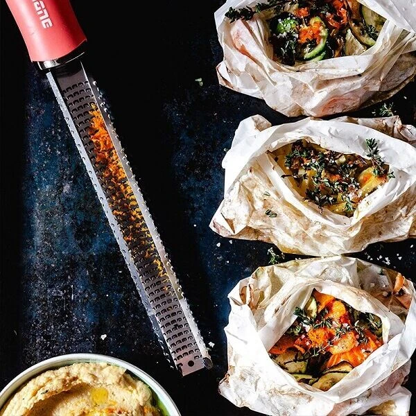 De Microplane lange rasp is door een laser uitgesneden en behoudt hierdoor lang zijn scherpte.