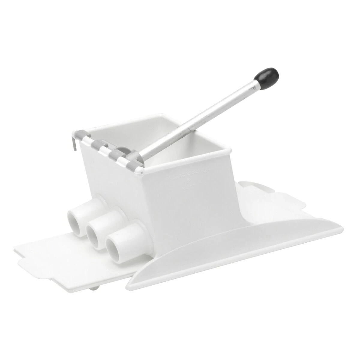 De kunststof krokettenpers van Millecroquettes is wit van kleur en heeft een afmeting van 28 x 15 x 22 cm (l x b x h). Gebruik de krokettenpers om eenvoudig uw eigen kroketten te maken van bijvoorbeeld aardappel, vlees of groenten. De pers wordt geleverd met twee plankjes, zodat u meerdere kroketten achter elkaar kunt bereiden.