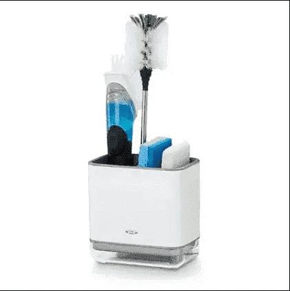De gootsteenorganizer van OXO Good Grips is vervaardigd uit kunststof. De lengte van de gootsteen-organizer is 14,5 cm, de breedte 9,7 cm en de hoogte is 13,6 cm. Handig om uw vaatdoekje, afwasborstel en schuursponzen in op te bergen.