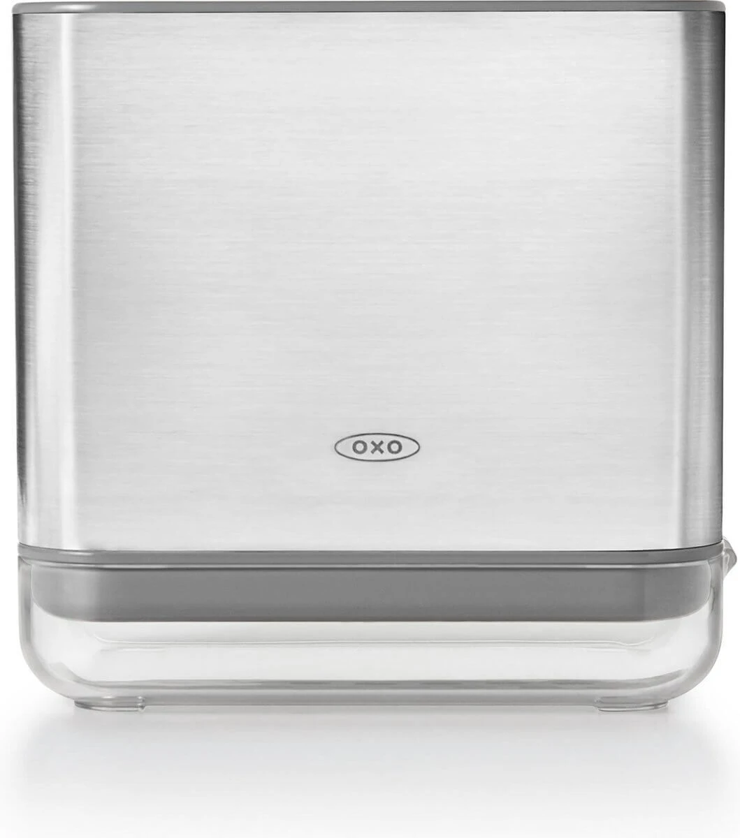 De gootsteenorganizer van OXO Good Grips is vervaardigd uit roestvrij staal. De lengte van de gootsteen-organizer is 13,6 cm, de breedte 14,5 cm en de hoogte is 9,6 cm. Handig om uw vaatdoekje, afwasborstel en schuursponzen in op te bergen.