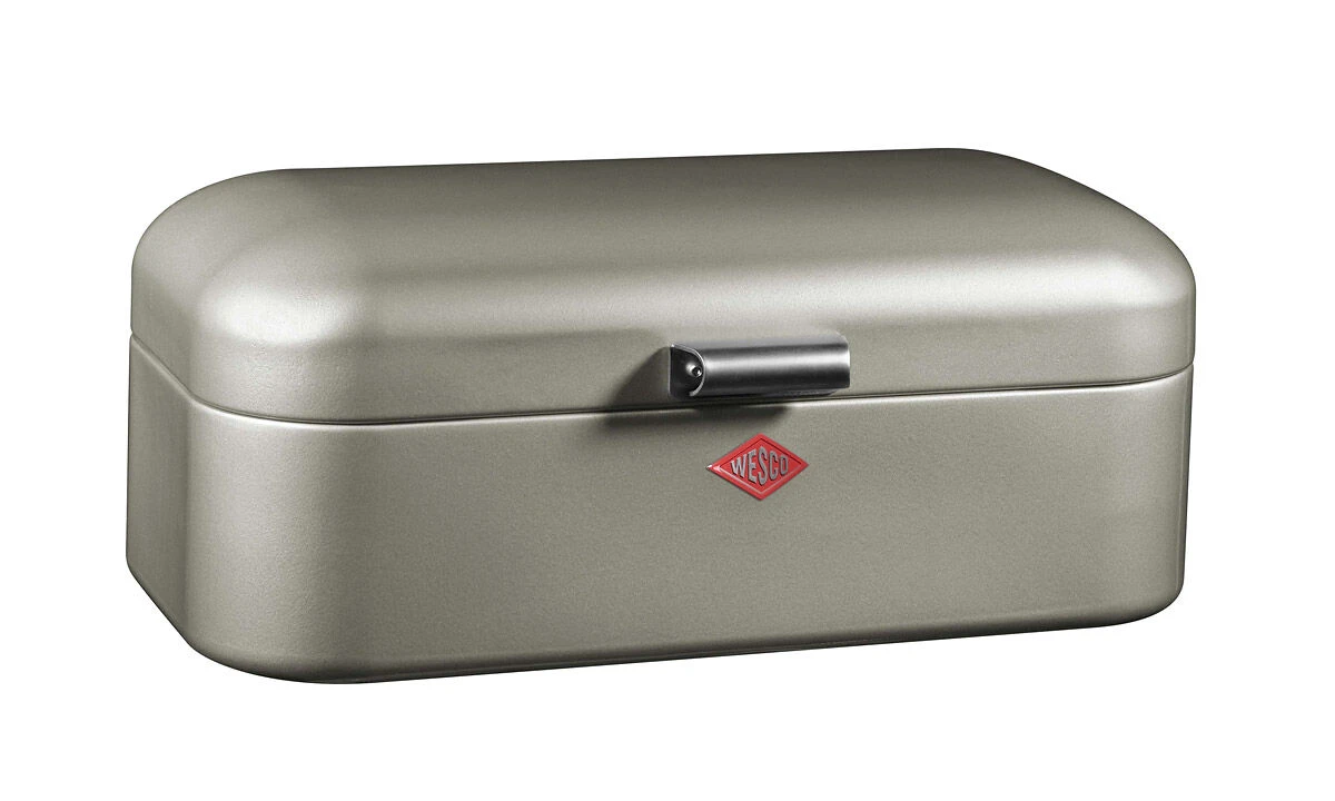 De plaatstalen Wesco Grandy broodtrommel is 43 cm lang, 23 cm breed en 17 cm hoog. De bewaardoos is uitgevoerd in de kleur ‘nieuw zilver’. De trommel houdt uw brood, koek en cake langdurig vers.